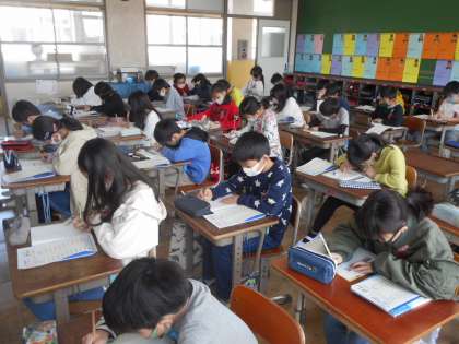 (上) 5年生は計算ドリルに取り組んでいました。集中集中!いい感じです。