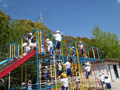 2年生になると,総合遊具は一番上の高さまでのぼることができます。