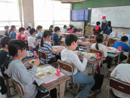 5年生の教室をのぞくと,ごはんとおいしくバランスよく食べている様子が見えました。