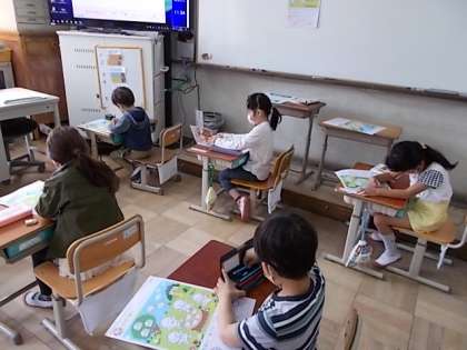 お友達のテストが見えないように,いつもの座席よりも広がって取り組むことを