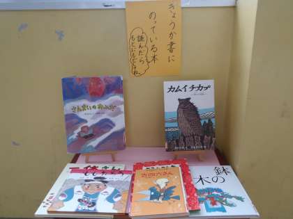 2年生の廊下に,教科書にのっている本を置いています。ぜひ手にとって読んでほしいと思っています。