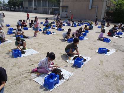植木鉢から土をだし,ほぐします。根っこをとりのぞいて,また植木鉢に戻します。肥料をまぜて,新しい土をたして,準備完了です。