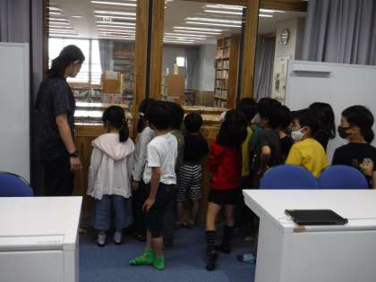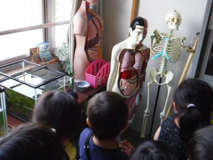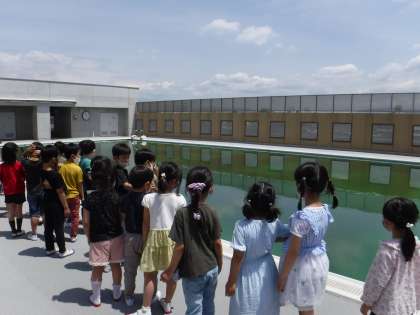 本日も学校探検をしました。今日は新校舎をまわりました。新校舎にはたくさんの特別教室があり,屋上にはプールがありました。おうちでもどんな教室を見てきたのかきいてみてください。