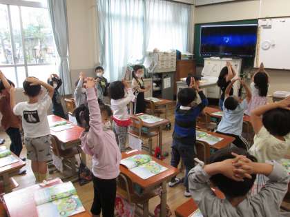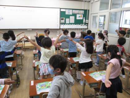 音楽の学習では,歌に合わせて体を動かしました。「ひらいた ひらいた」の歌詞に合わせてれんげの花が開いたり,すぼんだりするのを体で表現しました。