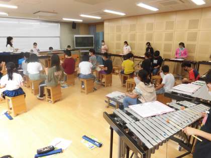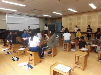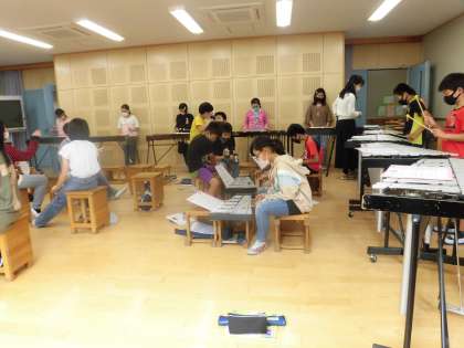 音楽は,飛沫感染防止や密を避ける学習として「パフ」の合奏をしています。楽器は希望制で,オルガン・木琴・鉄琴・グロッケン・タンブリン・カスタネット・トライアングル・マラカス・ウッドブロックなどを使っています。パートに分かれた楽譜を見ながら,同じ楽器の友だちと練習したり,全体練習したりしています。鉄琴は途中からの演奏なので演奏の出だしが遅れてしまうこともありますが,楽しく練習しています。
