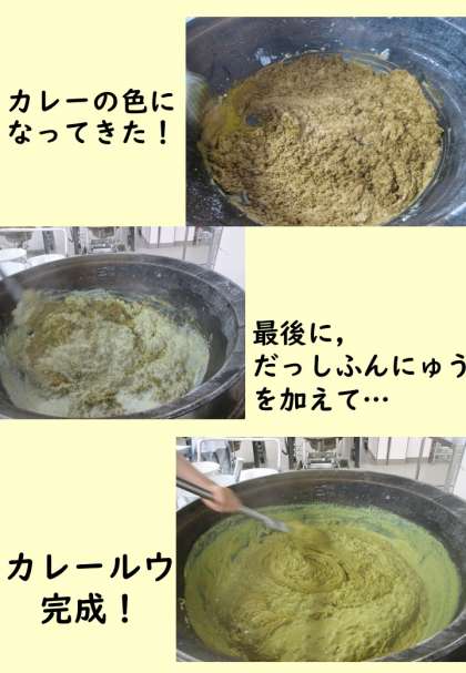ルウを作るときは,バターや小麦粉,カレー粉,だっしふんにゅうなど色々な食材が入ります。そして,これらの食材を,調理員さんがたくさん混ぜてできあがります。