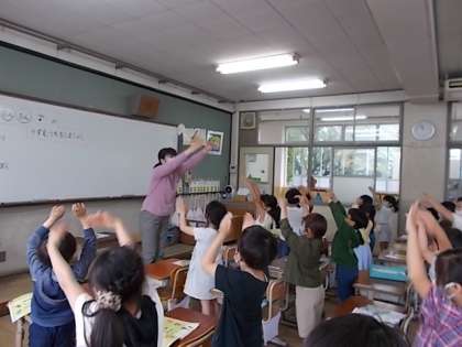 音楽「はくをかんじとろう」の学習では,「さんぽ」の歌に合わせて,拍を感じながら体を動かして楽しんでいます。歌詞に合わせた表現をして,「さんぽ」の歌の楽しさを味わうことができました。おうちでも披露してほしいと思います。