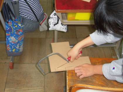 図工科の「わくわくプレイランド」の学習では,簡易のこぎりや糸のこぎりで木を切り,木の周りをヤスリと紙ヤスリで磨いた後,くぎを打ちつけて発射台を作っったり,切った木を段ボールに並べて,ビー玉が通る道を作ったりしています。写真のような迷路系のものやバスケットゴール,野球盤など,楽しく遊べるものをつくっています。自分の作りたい部品が完成したら,土台の段ボールにボンドで貼り付け,色を付けたり,飾り付けをしたりします。完成までには,時間がかかりそうですが,子どもたちは完成を楽しみにしています。