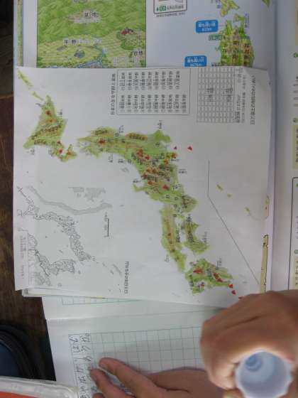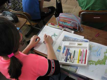 教科書や地図帳をもとに色づけを行い,地図を完成させていきました。
