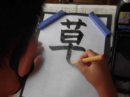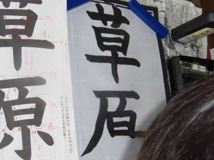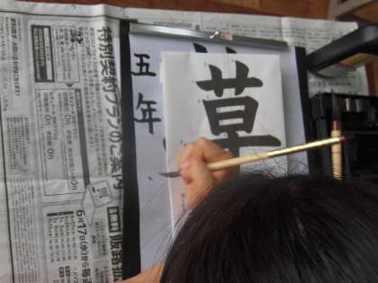 5年の書写学習は「草原」から始まりました。学習のめあては「中と外の部分の組立て方に気を付けて書こう。」です。「原」の中の部分は,文字の中心より少し右にずらすと,字形を整えて書くことができることを意識しながら練習を繰り返しました。子どもたちは,「始筆・送筆・終筆・始筆・送筆・終筆」と心の中で唱えながら,一画一画を丁寧に書き進めていました。名前を書くのは今年で3年目になります。2年間の経験を生かし,小筆の持ち方や文字の太さに気をつけて書いていました。高学年になったので,習ってない漢字もありますが,漢字で書いていきます。