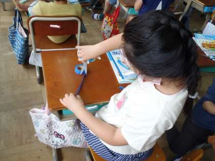 ものさしで線を書いたり,「10cmはどれくらいかな。」と予想したりと,長さの学習を進めています。