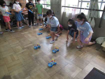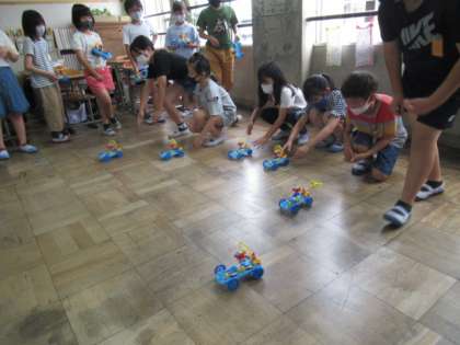 「やったあ,走った!」という子と「あれ?動かへん。なんで?」という子が。