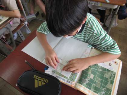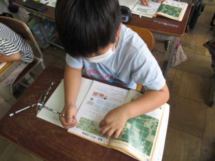 初日の今日は,うすい紙に書かれた線が,教科書の挿絵のどの部分と重なるのかを探しました。