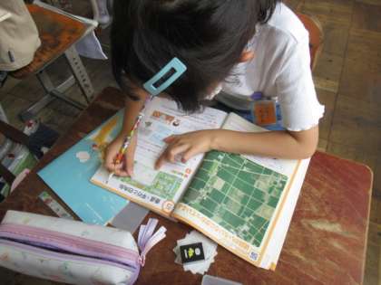 みんな,挿絵の上に紙を置いては「これ違うなあ。」「あ,これや!」などとつぶやきながら学習を進めていました。