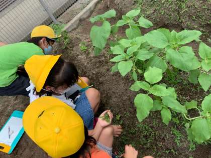 自分が育てていた植物の根・くき・葉の観察をしました。葉の形やくきの太さなどが前回よりも大きくなっていることに気づき,観察カードに前回との違いを書いていました。観察が終わったら,雑草をみんなで協力して抜いてくれました。大きく育ってほしいですね。
