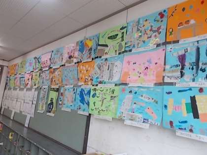 1年生図画工作科「やぶいたかたちからうまれたよ」の作品がついに完成しました。