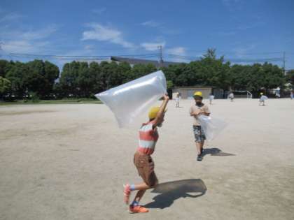 初日は,大きなビニール袋に空気を入れて,とじこめてみました。