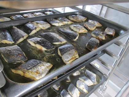 さとうやみりん,しょうゆの調味液にゆず果汁を加えて作った「さわらの幽庵焼き」は小学生に大好評でした。さわらは,「魚」に「春」と書いて「鰆(さわら)」と読みます。春にたくさんとれる魚です。