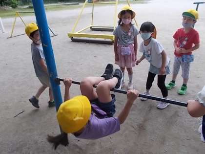 鉄棒遊びのクラスでは,「ぶたのまるやき」,「てんごくまわり」,「じごくまわり」と,まだ,学校では習ったことのない技を次々に披露してくる子どもたちがたくさんいました。