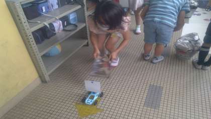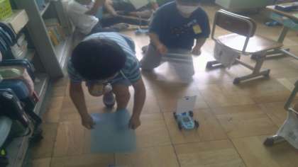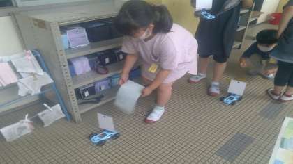風の力で動く車を作って動かしてみました。友だちと競争したり一斉に走らせたりしていました。動かしたことをもとに,風の強さをかえると,ものの動き方はかわるのか予想をして,クラスで自分の考えを交流しました。次の時間は実験をしてどうなるか調べてみたいと思います。