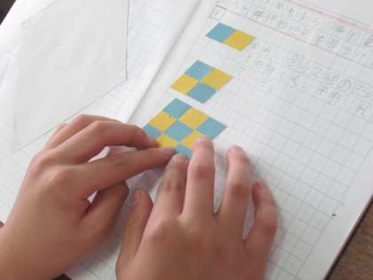 今日は,平行四辺形の色カードをしきつめて,いろいろな大きさの平行四辺形を探しました。