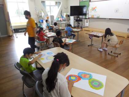 まず,花火を水分を多めに円形に色をにじませながら重ねていきました。