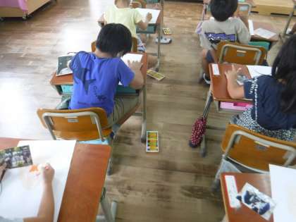 敬老ポスターをかきました。自分のおじいちゃん,おばあちゃんや地域のおじいちゃんの写真をよく見ながら顔の形や鼻・口など一生懸命描きました。