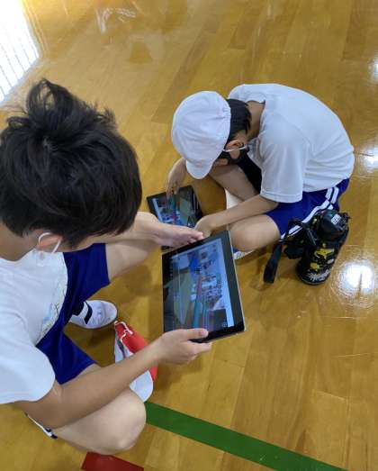 体育科ではマット運動の学習をしています。GIGA端末で自分の動きを撮影してチェックしたり,見本の動画を見てポイントを確かめたりしながら,新しい技に挑戦しています。