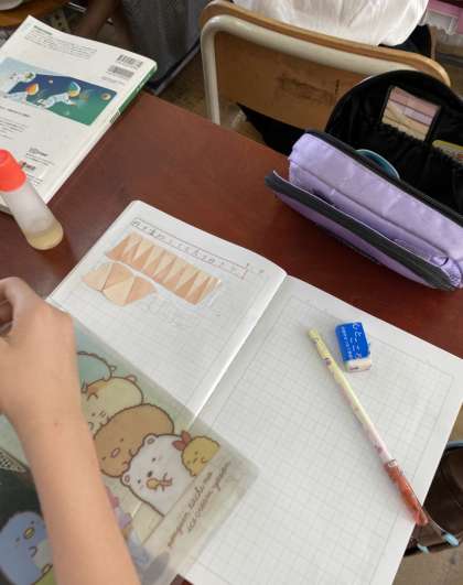 算数の円の面積では,実際に円を変形させながら,これまでに習った図形の公式に近づけられないかと考え中。こうやって手を動かしながら考えるということも,大事な学びの一つです。