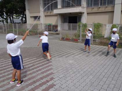 「8の字とびをしよう。」や「ゆうびんやさんをしよう。」など,声をかけあって楽しく活動しました。