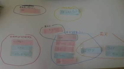 山小屋で三日間すごすなら何がしたいか,何をもっていくか考えたことをふせんに書き,意見を分類しました。グループで5つしか物を持っていけないため,何がいるか,何がいらないかを考えていました。