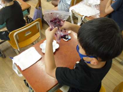 今週1年生では,生活科の学習で色水遊びをしました。あさがおの花びらを袋に入れて揉んでいくと,花びらの色が付いた水ができます。その水に和紙をつけてたくさんの模様を作りました。模様がきれいにできると歓声が上がり,活動を楽しむ子どもたちの姿が見られました。