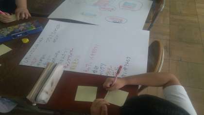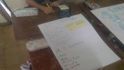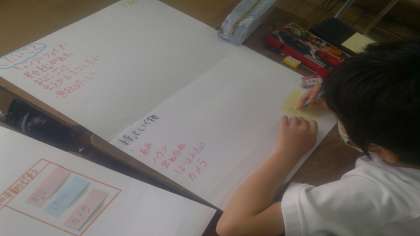 山小屋で三日間すごすなら何がしたいか,何をもっていくか決めたものを各自見て周り,ふせんに感想などを書きました。それぞれが良く計画されており,「みんなで山小屋へ実際に行って,実行したいね!」と話していました。