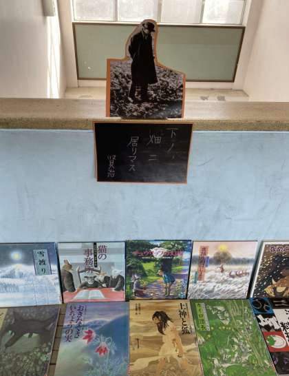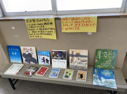 教室前に宮沢賢治の作品を集め,並行読書をしています。様々な作品を読み比べて作者の表現方法や生き方とのつながりを見つけていってほしいと思います。
