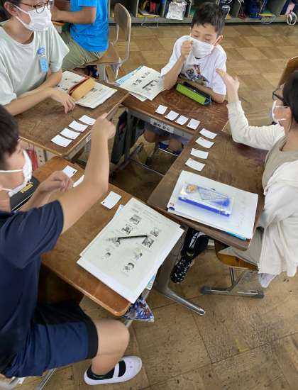 外国語では過去形の表現を使って,「夏休みにどんなことをしたか」「どうだったか」という会話をしています。ゲーム形式で何度もこの表現に親しみました。