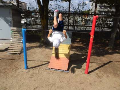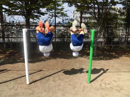 体育学習では,鉄棒と短なわとびの学習をしています。鉄棒運動は,上がり技・支持回転技・下り技の3種類があります。上がり技は6こ,支持回転技は9こ,下り技は7この技があります。学習では,連続技,組み合わせ技,挑戦する技に分けて学習しています。短なわとびは,両足とび(前・後)・片足とび(前・後)・かけ足とび(前・後)・交差とび(前・後)・あやとび・二重とび(前・後)・交差二重とび・三重とびの8種類の技があります。これらのとび方を連続技や組み合せ技,新しい技に分けて挑戦しています。