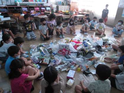 おうちから持ってきた廃材を使って,転がしたり,つんだり,たたいたり,はじいたりして遊びました。これから,廃材を生かして動く仕組みを作って遊んでいきます。