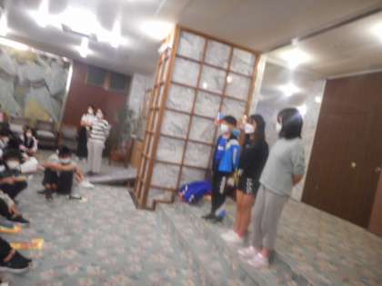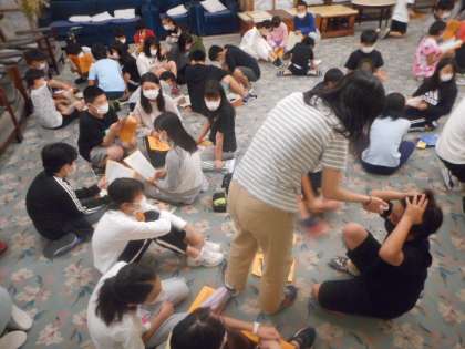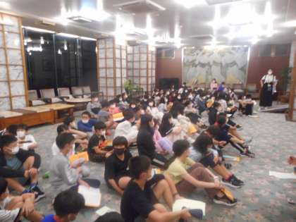 おはようございます。徳島から,1日目最後のプログラム,「班ミーティング」の様子を伝えます。今日一日の活動を振り返って,学習に向かうことや思い出を作ることを頑張れたという意見が多かったです。中には社会性を身に着けたいという意見もでました。二日目も頑張ってほしいと思います。