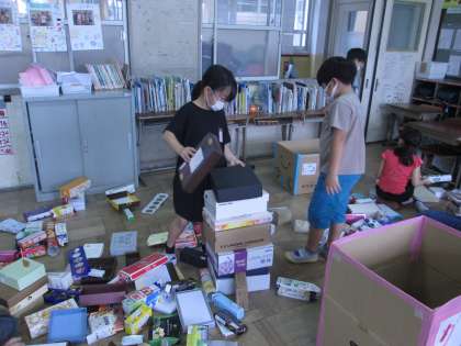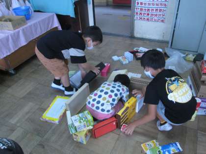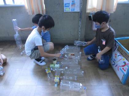 「たたく」遊びでは,ペットボトルの形や大きさによって音が違うということに気が付いたり,「つむ」遊びでは,大きい箱を一番下にして,その上に小さい箱を積み上げていくと安定するということに気が付いたりしていました。