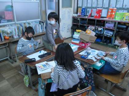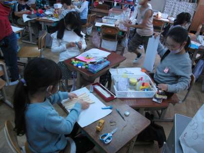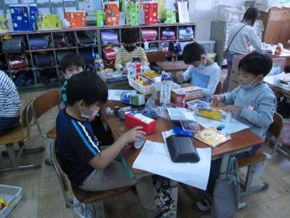 廃材を使って「おもちゃ」を作っています。魚つりゲームやわなげ,楽器など,おもいおもいに設計図をかきました。