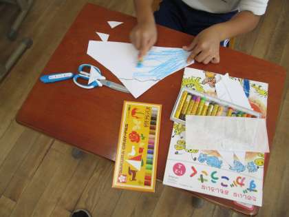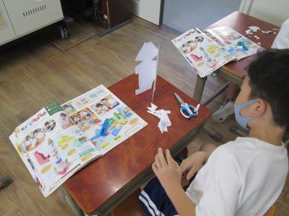 「おってたてたら」の学習では,色画用紙を折り,はさみを使って様々な形に切りました。切った形に色々な絵を描いて乗り物や動物を作ることができました。