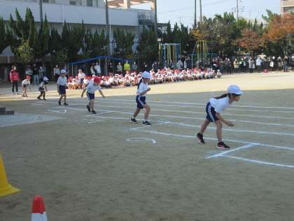 開会式が始まり,準備運動の後は80m走です。お家の方の応援を背に力いっぱい走りました。