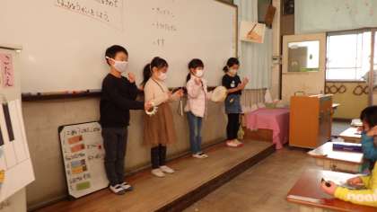 音楽科 「がっきとなかよくなろう」で鍵盤ハーモニカ以外の楽器にも触れていきました。それぞれの楽器の特徴を生かした音の鳴らし方を考え,工夫をしていました。グループごとに行った発表会の様子です。