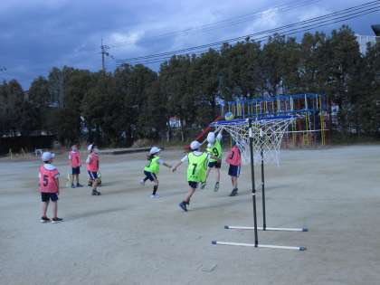 パスゲームの学習をしています。友だちと声をかけあいながら,パスをつないでゴールを目指しています。