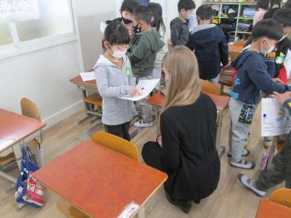 1年生の英語の学習は,蝶のカードを友達に紹介しました。カードに塗った色を1つ1つ英語で言いながらクラス全体で交流することができました。また,ALTのローラ先生にも紹介を行うこともできました。