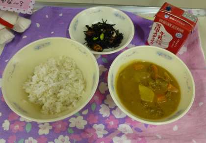 今日は牛肉入りのカレー。学校中にカレーのいい香りが広がると,さらに食欲も増したようで,子どもたちはおいしそうな顔でもりもりと食べていました。