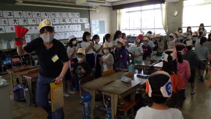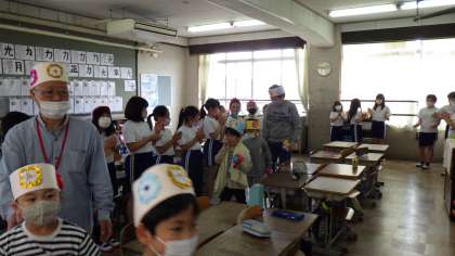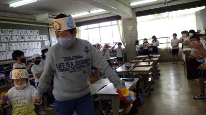 先生が先頭を歩いて,さくら学級の1年生と一緒にパレードをしている様子です。先生も子どもたちも楽しそうです。