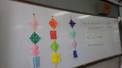 明日の図画工作では,はさみを使って写真のようなかざりを作ります。はさみで紙を切る練習をして,少しずつ自分の好きなかざりに挑戦してもらおうと思っています。