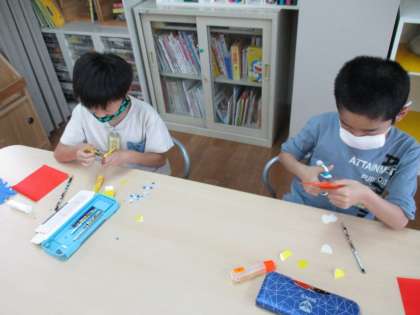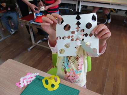 折り紙を折ったり,切ったりして飾りを作りました。自分なりに線を細かく描き,どんなふうに仕上がるかなとワクワクした様子で切り進め,様々な柄や人,眼鏡みたいなものまで作ることができました!