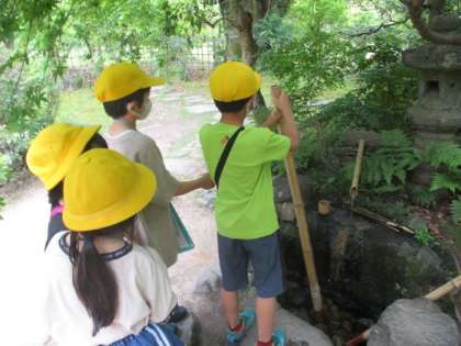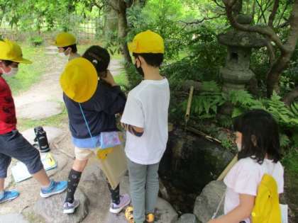 この写真は水琴窟で水の音を聞いている様子です。とても小さな音で,集中して聞いてみると,素敵な音が鳴っているのが聞こえました。はじめて水琴窟を体験した子どもたちもたくさんいたようで,音を聞いて一人づつ順番に笑顔になっていきました。